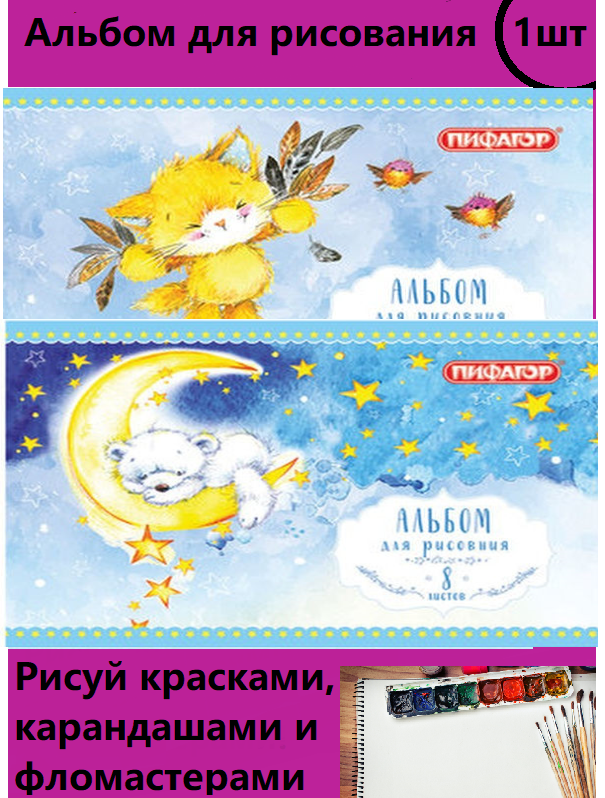 Альбом для рисования Пифагор Пушистые зверята, на скрепке. Содержит 8 листов плотностью 100 г/м2 формата А4.