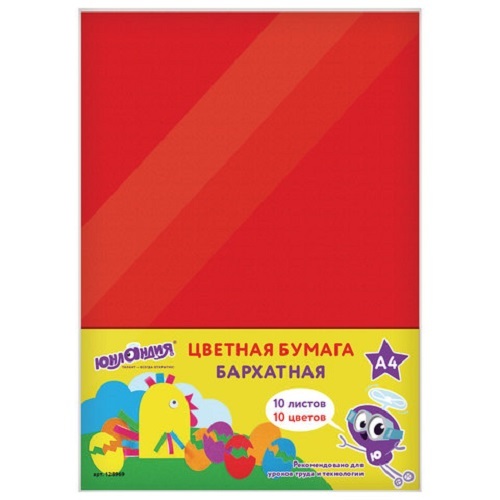 Набор бархатной односторонней цветной бумаги плотностью 110 г/м2 включает 10 листов формата А4 (210х297 мм) в 10-ти разнообразных и насыщенных однородных цветах. Листы упакованы в полиэтиленовый пакет с липким краем, легко режутся и сгибаются.