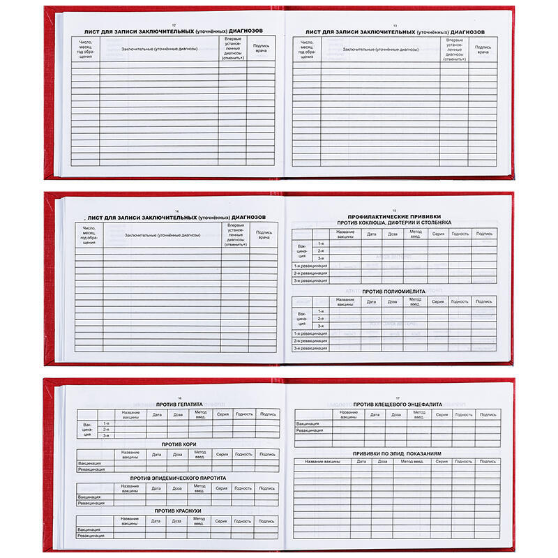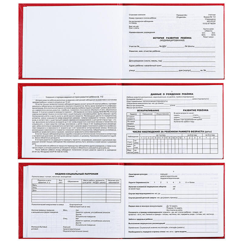 Бланк Медицинская карта ребёнка. История развития ребенка. Формат - А5. Количество листов - 196. Утвержденная форма - 112. Внутренний блок - офсетная бумага. Тип скрепления-склейка. Материал обложки - бумвинил. Ориентация - горизонтальная. Утвержден Министерством здравоохранения. Соответствует государственным стандартам.
