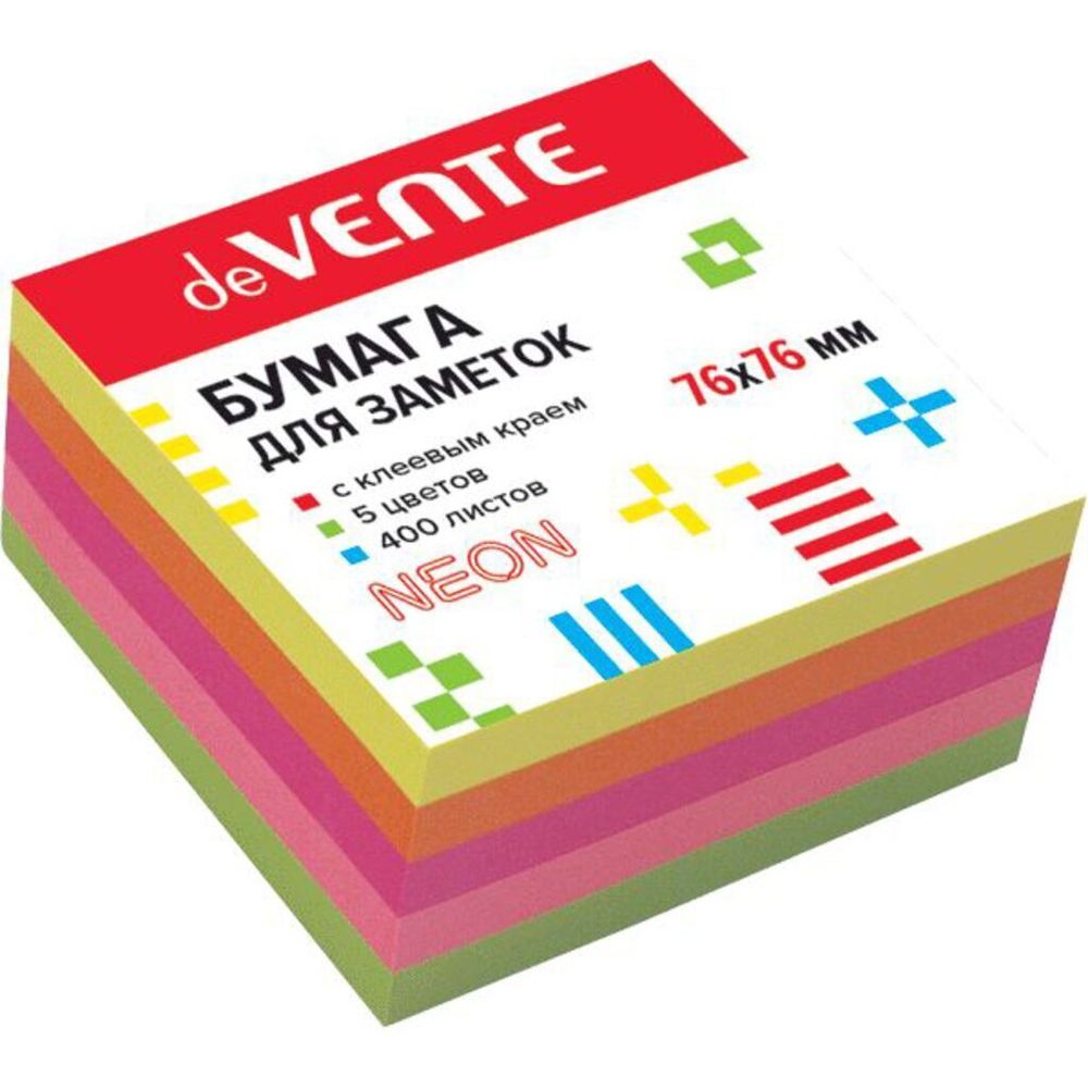 Бумага для заметок с клеевым краем 76*76мм 400 л. Плотность бумаги 75г/м2. В упаковке 5 неоновых цветов - зеленый, оранжевый, малиновый, розовый, желтый. Упакован в термоусадочную пленку. Блок бумаги с липким слоем предназначен для удобного использования в качестве бумаги для заметок, напоминаний, закладок. На один край листа нанесен липкий клейкий слой, который надежно прикрепит листок к ровной поверхности. Легко приклеивать и отклеивать. Клей не оставляет следов и пятен.