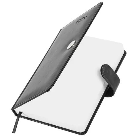 Жесткая книжная обложка прошита по периметру, имеет легкую рельефную фактуру и напоминает натуральную кожу. Материал обложки подходит для горячего тиснения. Обложка фиксируется магнитной застежкой, поэтому ежедневник не откроется в сумке или портфеле и страницы не помнутся.