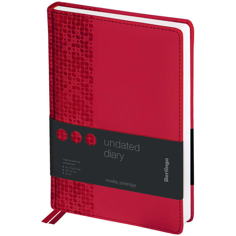 Недатированный ежедневник Berlingo Vivella Prestige формата А5 с твердой матовой обложкой из экокожи. Внутренний блок состоит из 160 листов высококачественной белой бумаги повышенной плотности 80 г/м². Перфорированные уголки, справочная информация и 2 закладки-ляссе.