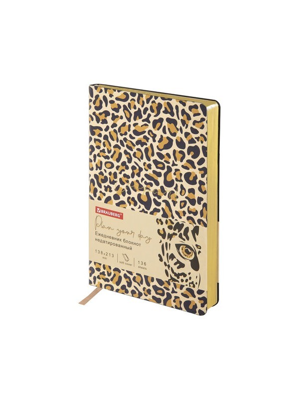 Ежедневник BRAUBERG VISTA "Leopard". Внутренний блок включает 136 листов тонированной бумаги цвета "слоновая кость" плотностью 70 г/м2, формат А5. Дополнением является закладка-ляссе, с помощью которой можно быстро открыть ежедневник на нужной странице.