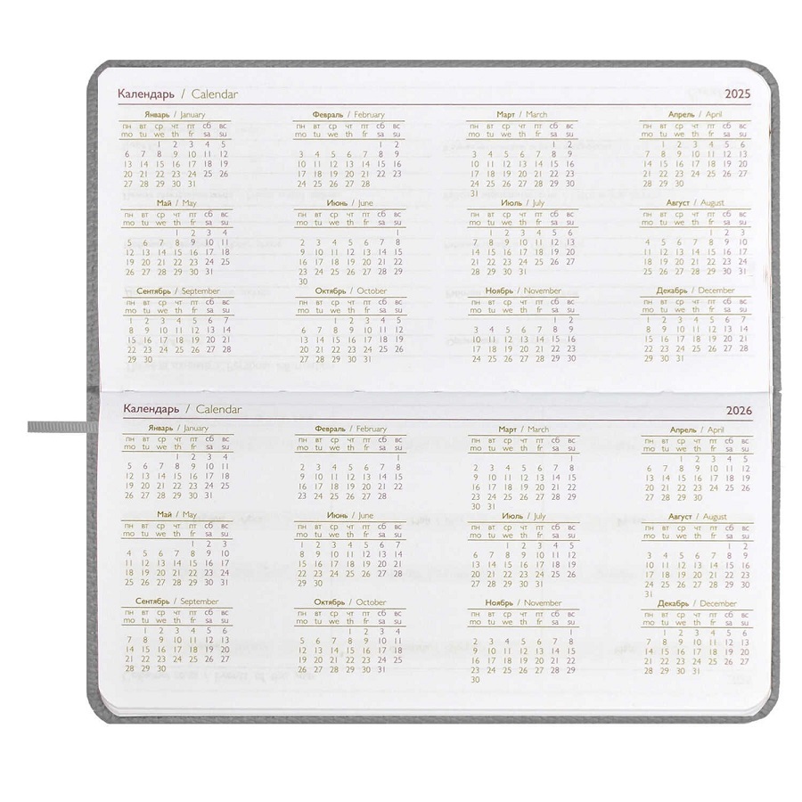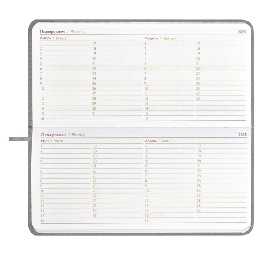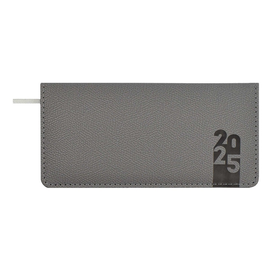 Еженедельник датированный 2025 , 170х88 мм, 64 л., ДЖУТ СЕРЫЙ (кожзам: твёрдый переплёт с поролоном, материал обложки: искусственная кожа "Джут"; декор: блинтовое тиснение; способ крепления блока: ниткошвейный; вн. блок: 64 л., белый офсет 70 г/м², печать в две краски (линия), справочный материал: есть; перфорация углов блока: нет; закладка/-и: одно ляссе; каптал: есть; форзац: без печати; персонализация возможна: да; индивидуальная упаковка: ПЭТ-пакет)