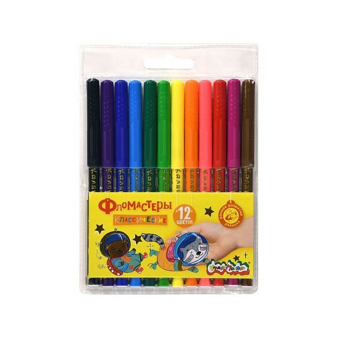 Фломастеры Каляка-Маляка® соответствуют самым высоким мировым стандартам качества и безопасности! Полипропиленовый корпус обладает повышенной устойчивостью к излому, не образует острых краев при повреждении. Безопасный вентилируемый колпачок обеспечит свободное прохождение воздуха при случайном попадании в дыхательные пути. Прочный пишущий узел не деформируется и не продавливается.