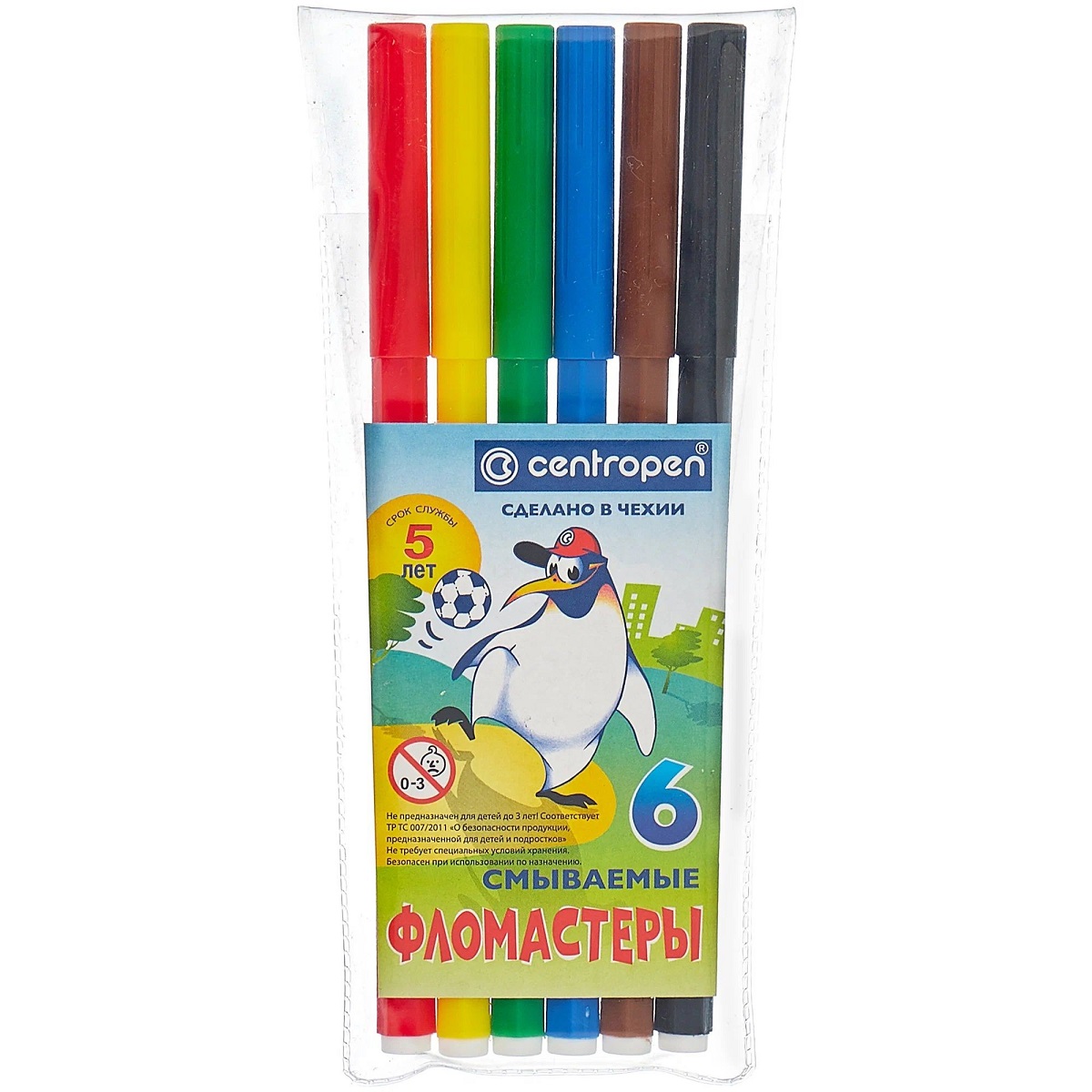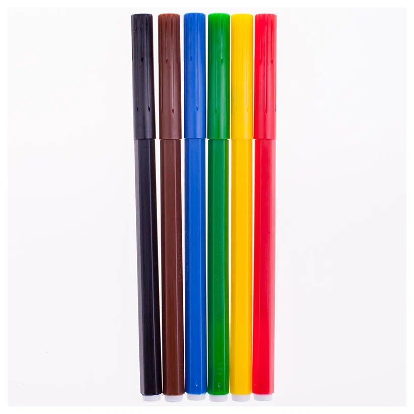 Набор фломастеров 6 цветов. Эргономичная зона обхвата. Безопасные для здоровья чернила. Не высыхают в течение 5 лет, смываемые, вентилируемый колпачок. Корпус шестигранной формы, корпус и детали изготовлены из полипропилена. Пулевидный пишущий узел, устойчивый к вдавливанию. Толщина линии - 1 мм.