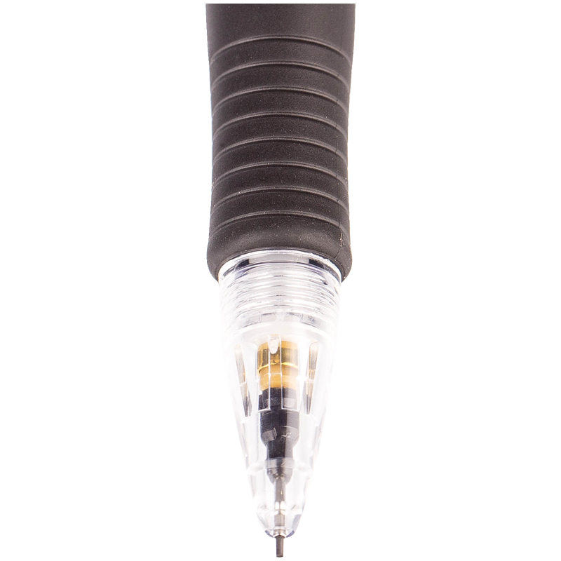 Карандаш механический в прозрачном пластиковом корпусе с резиновым упором, препятствующим выскальзывание карандаша из пальцев, и убирающейся металлической цангой. Корпус - пластик, цвет элементов - черный. Толщина грифеля - 0,5 мм, твердость грифеля - HB.