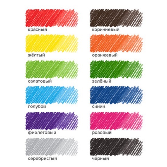 Набор состоит из 12 цветов: черный, синий, голубой, салатовый, зеленый, желтый, оранжевый, розовый, красный, серый, фиолетовый, коричневый. Шестигранная форма сечения корпуса позволяет не скатываться карандашу с поверхности стола во время занятий рисованием. Карандаши изготовлены из высококачественного материала и имеют лакированный корпус. Качество исполнения гарантирует легкую заточку. Грифель диаметром 3 мм обладает повышенной прочностью. Все карандаши заточены и поставляются в картонной упаковке с европодвесом