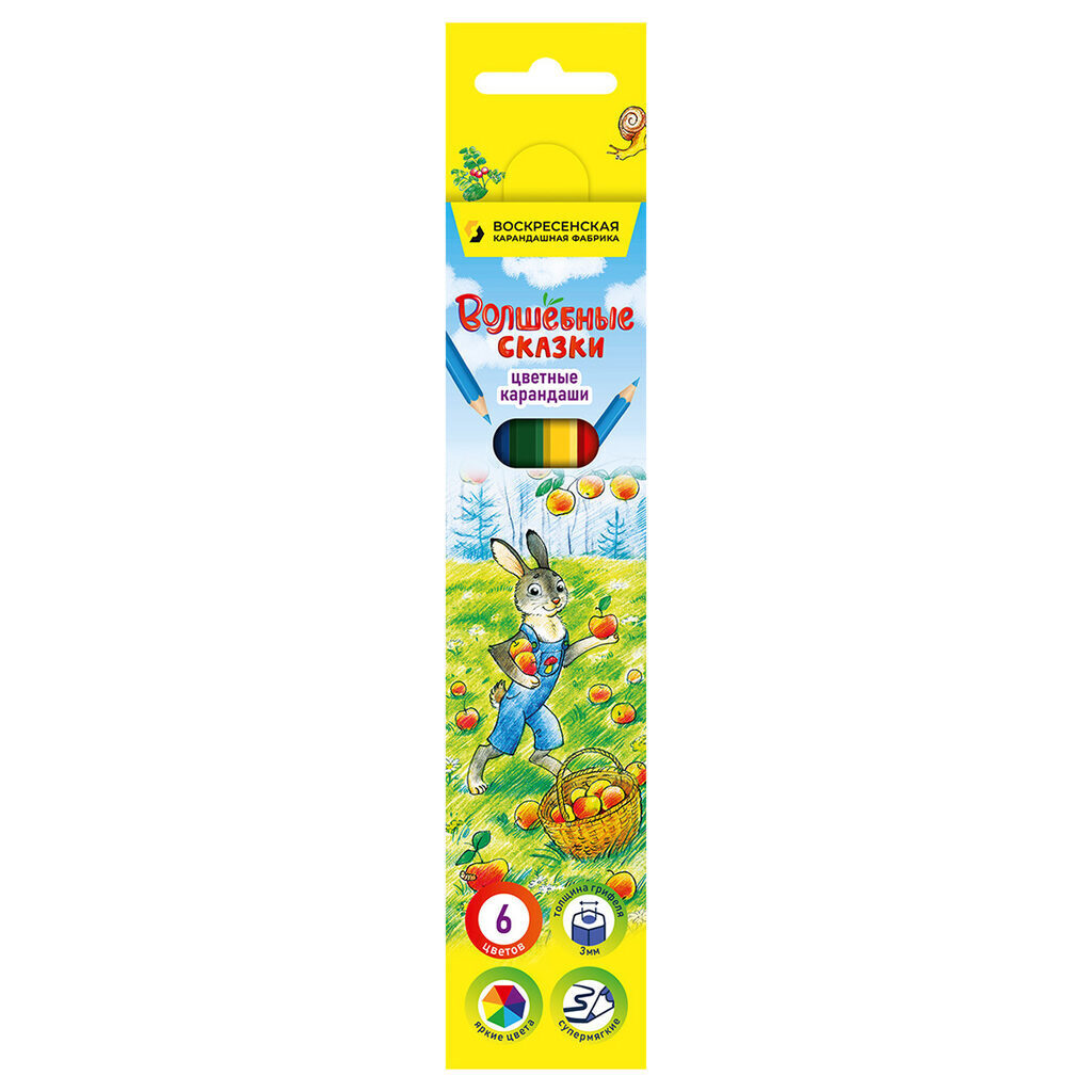 Набор цветных шестигранных карандашей заточенные, окраска корпуса в цвет стержня. 6 цветов в наборе: желтый, красный, зеленый, синий, коричневый, черный. Изготовлены из сырья и материалов природного происхождения и качественной химически необработанной древесины мелколистной липы, выращенной в экологически чистых районах России. Особая технология вклеивания грифеля обеспечивает ударопрочность карандашей. Товар сертифицирован для детей от 3-х лет и безопасен для использования. Новая серия цветных карандашей «Волшебные сказки» для самых юных художников! Супермягкие стержни, яркие и красочные цвета при любой силе нажатия, легкая и бережная заточка, привлекательный дизайн наборов с добрыми героями сказок, которые понравятся как родителям, так и маленьким любителям рисования.