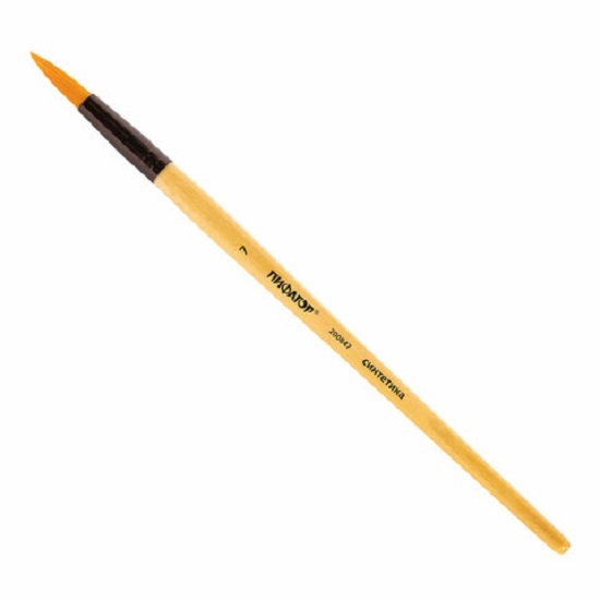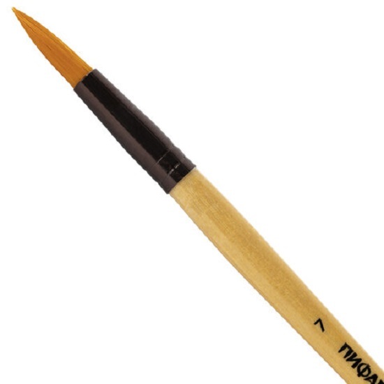 Кисть из синтетического ворса эластичная, не распадается, хорошо держит форму, долговечна и надежна. Кисть № 7 позволит прорисовывать детали и наносить крупные мазки и линии. Деревянную лакированную рукоятку кисти удобно держать в руке.