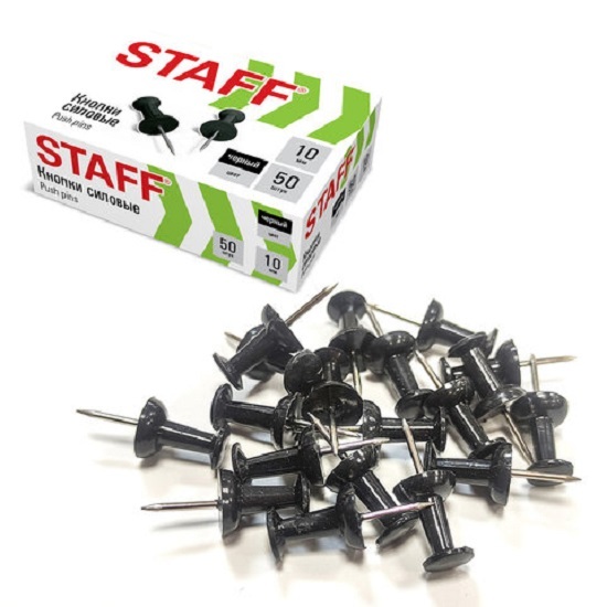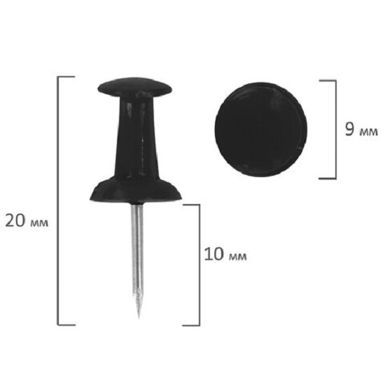 Кнопки силовые гвоздики используются для крепления бумаги на пробковые и фетровые доски, а также на другие поверхности. Имеют черную пластиковую шляпку диаметром 9 мм и стальное остриё длиной 10 мм. 50 штук в картонной коробке.