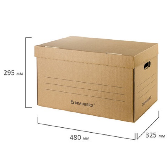 Толщина картона - 3 мм. Вмещает: 6 папок-регистраторов с толщиной корешка 80 мм или 3 накопителя документов с толщиной корешка 150 мм. Выдерживает до 30 кг. Размер короба - 29,5x48x32,5 см. Имеет откидную крышку и отверстия по бокам для удобства переноски. Поставляется в разобранном виде.