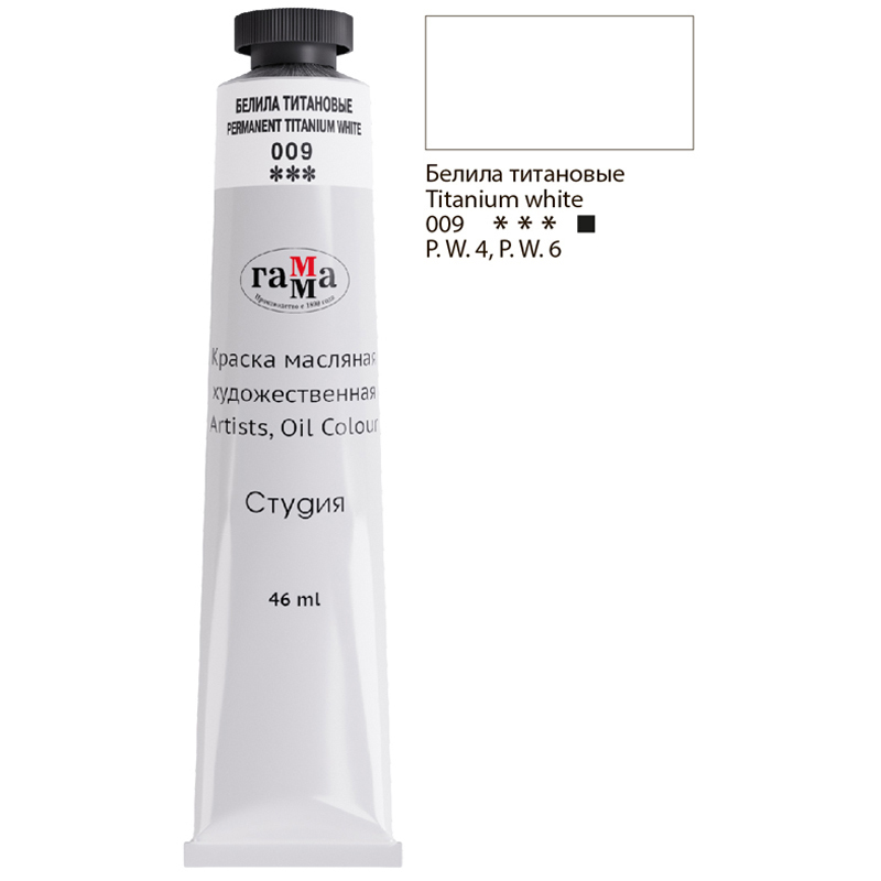 Штучная масляная краска серии «Студия» белого титанового цвета не уступает тонкотёртым масляным краскам по степени перетира, пастозности и светостойкости. Состав красок экологически безопасен благодаря имитациям кадмиево-кобальтовой группы пигментов. Продукт идеально подходит для начинающих художников и студентов художественных училищ. Объём тубы — 46 мл.