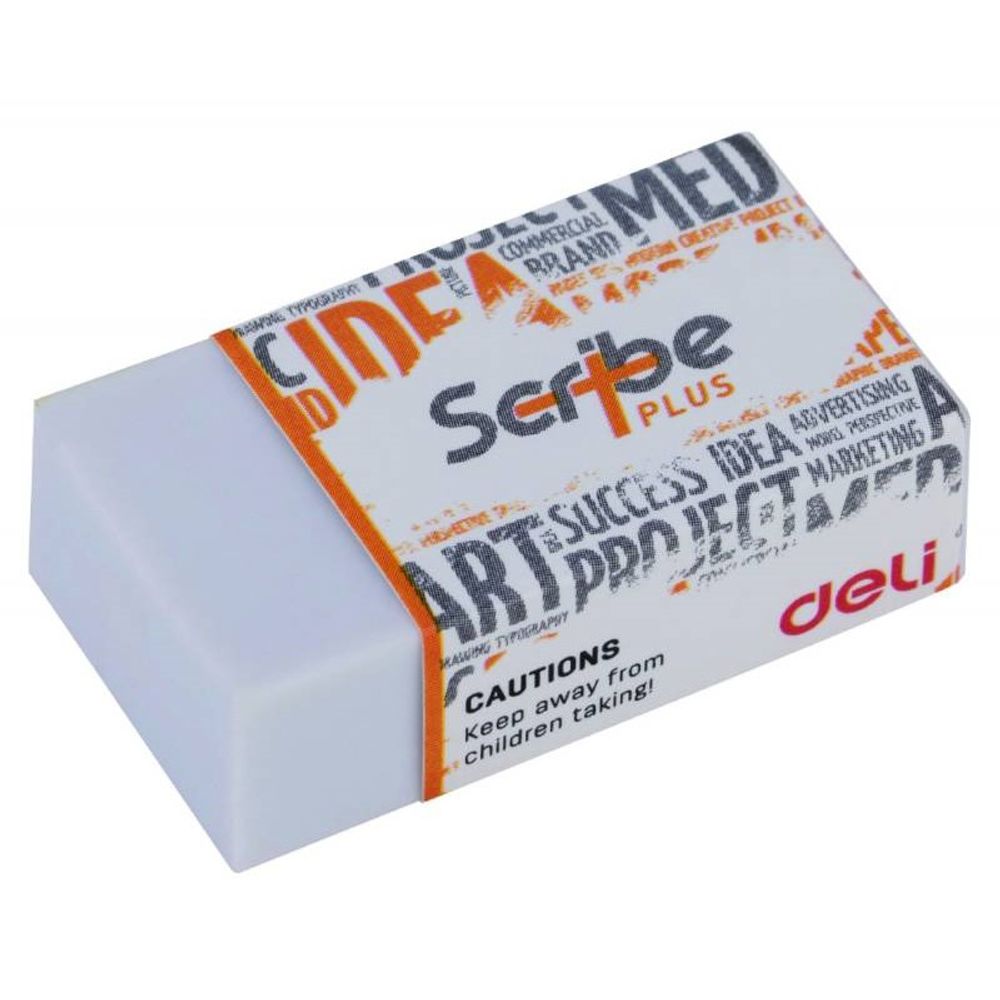 Ластик Deli — это белый мягкий ластик размером, предназначенный для удаления следов чернографитных карандашей. Он поставляется в индивидуальной картонной упаковке и подходит для использования в школе, офисе и для рисования.
