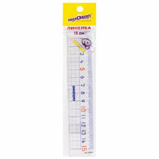 Прозрачная линейка c сине-красным принтом. Имеет безопасные закруглённые углы. Длина шкалы составляет 15 см. Линейка обладает четкой разметкой, что делает ее удобной в использовании. Упакована в пакет с европодвесом.