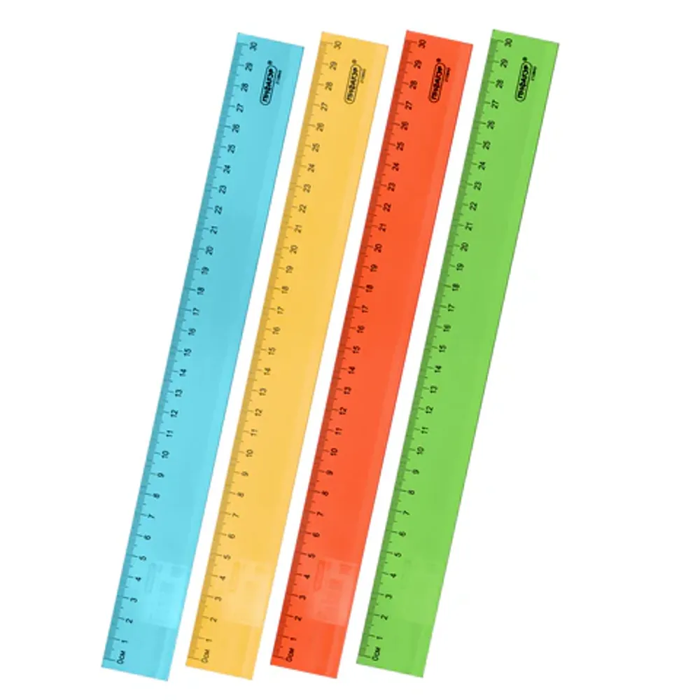 Изготовлена из прочного прозрачного неонового пластика. Имеет безопасные закруглённые углы и четкую контрастную миллиметровую шкалу. Длина шкалы составляет 30 см. Поставляется в нескольких вариантах цвета (без возможности выбора).