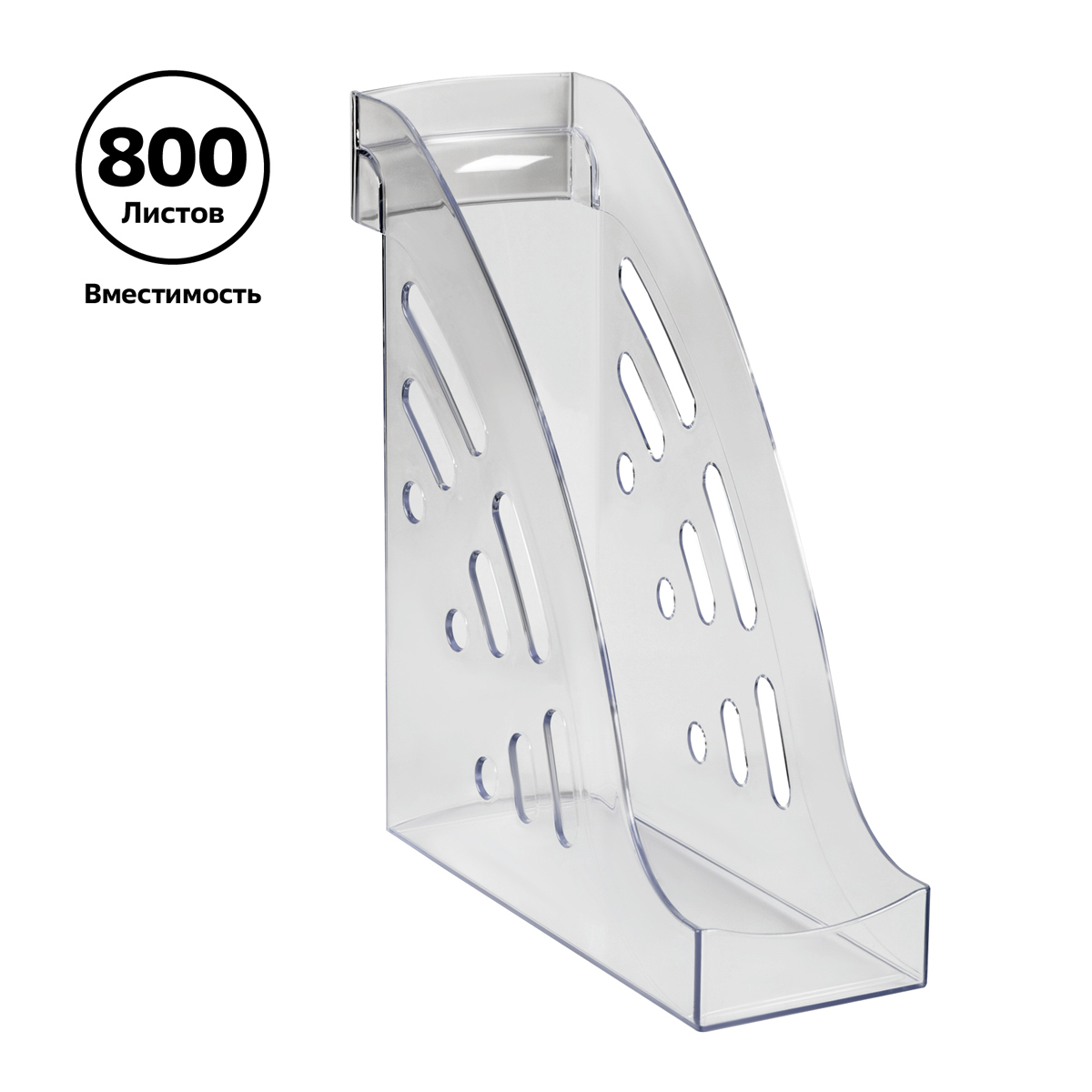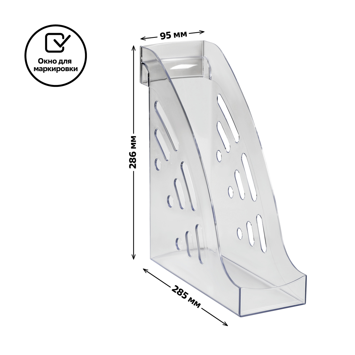 Вертикальный лоток для бумаг предназначен для хранения документов формата А4. Для удобного вытягивания с полки на торце предусмотрен захват, который также служит окном для маркировки с возможностью смены вкладышей. Изделие изготовлено из качественного пластика. Материал известен своей долговечностью, устойчивостью к ударам, поэтому лоток отличается надёжностью. Подходит для хранения тяжёлых каталогов и папок. Цвет лотка - прозрачный. Лоток вмещает до 800 листов. Изделие высотой 286мм, глубина 285мм, шириной 95мм.