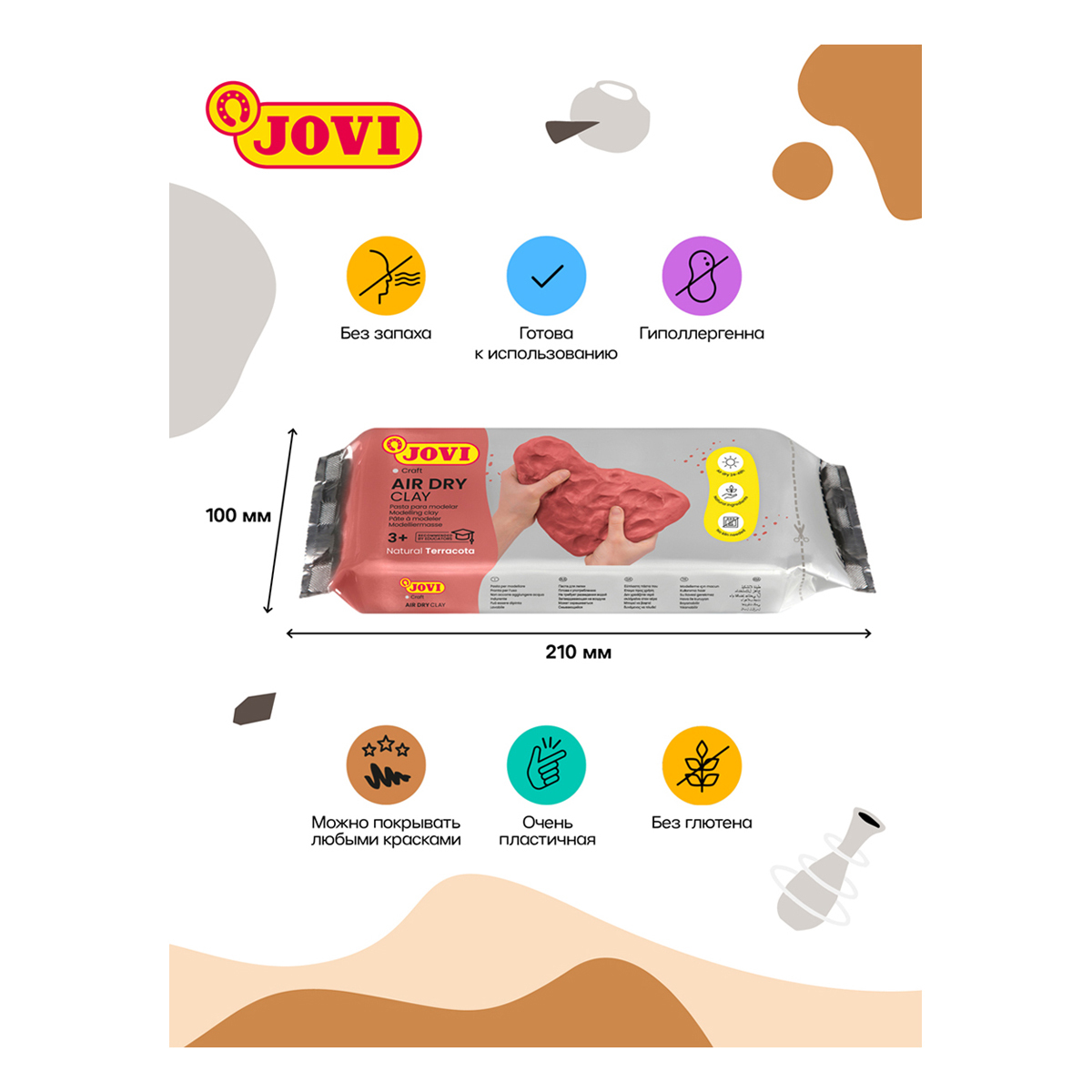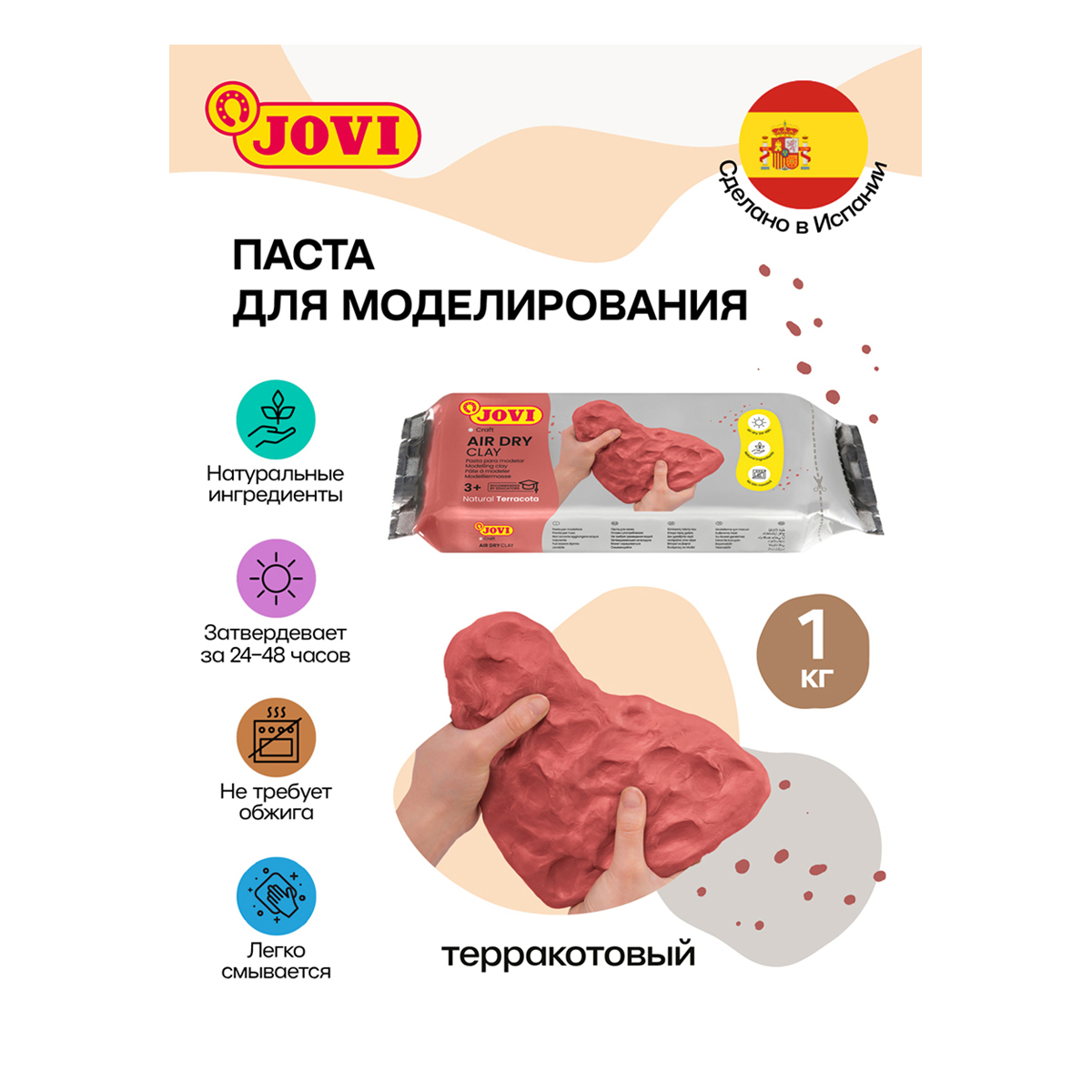 Паста для лепки и моделирования, отвердевающая на воздухе. Готова к использованию, по свойствам напоминает глину, но работать с ней легче. Моделируется руками, при необходимости можно использовать инструменты. Пластична, легко лепится, раскатывается, режется, принимает любую форму, не липнет к рукам. Без запаха. Затвердевает на воздухе, после высыхания становится очень прочной, не трескается при высыхании. Готовое изделие можно расписывать красками и декорировать в различных техниках. Хранить массу необходимо в герметичной емкости. Отлично подойдет для лепки дома, в школе, художественных студиях и для профессионального использования. Основной состав: вода, карбонат кальция, целлюлоза, каолин. Страна производства Испания.
