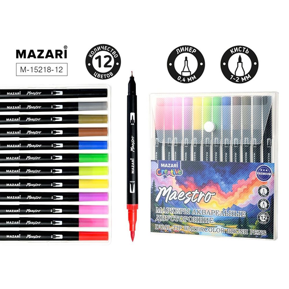 Маркеры акварельные 12 цветов имеют высокопигментированные чернила со специальным акварельным эффектом. Подходят для художественных и декоративных работ, двусторонние: кистевидный наконечник из фетра для плавных мягких линий и закрашивания элементов рисунка, пулевидный наконечник в металлической обойме для точечной прорисовки деталей, обводки контура, четких линий и штрихов