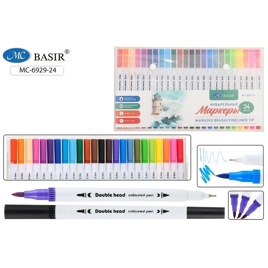 Маркеры универсальные, незаменимы для художников, иллюстраторов и дизайнеров. Подходят для скетчинга, каллиграфии, леттеринга, а также для создания эскизов и иллюстраций. Наконечник акварельного маркера- настоящая нейлоновая кисть, которая позволяет создавать линии различной толщины и формы Набор маркеров-акварельные: двусторонние-линер 0,4 mm, кисть 1-4 mm; чернила на водной основе; круглый белый корпус, вентилируемый цветной колпачок, пластиковая упаковка с европодвесом, 24 цвета.