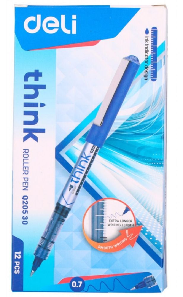 Ручка-роллер, выполненная в сером и синем цветах. Имеет стреловидный пишущий наконечник, диаметр которого равен 0,7 миллиметра. Внутри заполнена чернилами черного цвета. . На боковой части ручка имеет серый клип, за счет которого роллер можно прикрепить к карману или тетради.