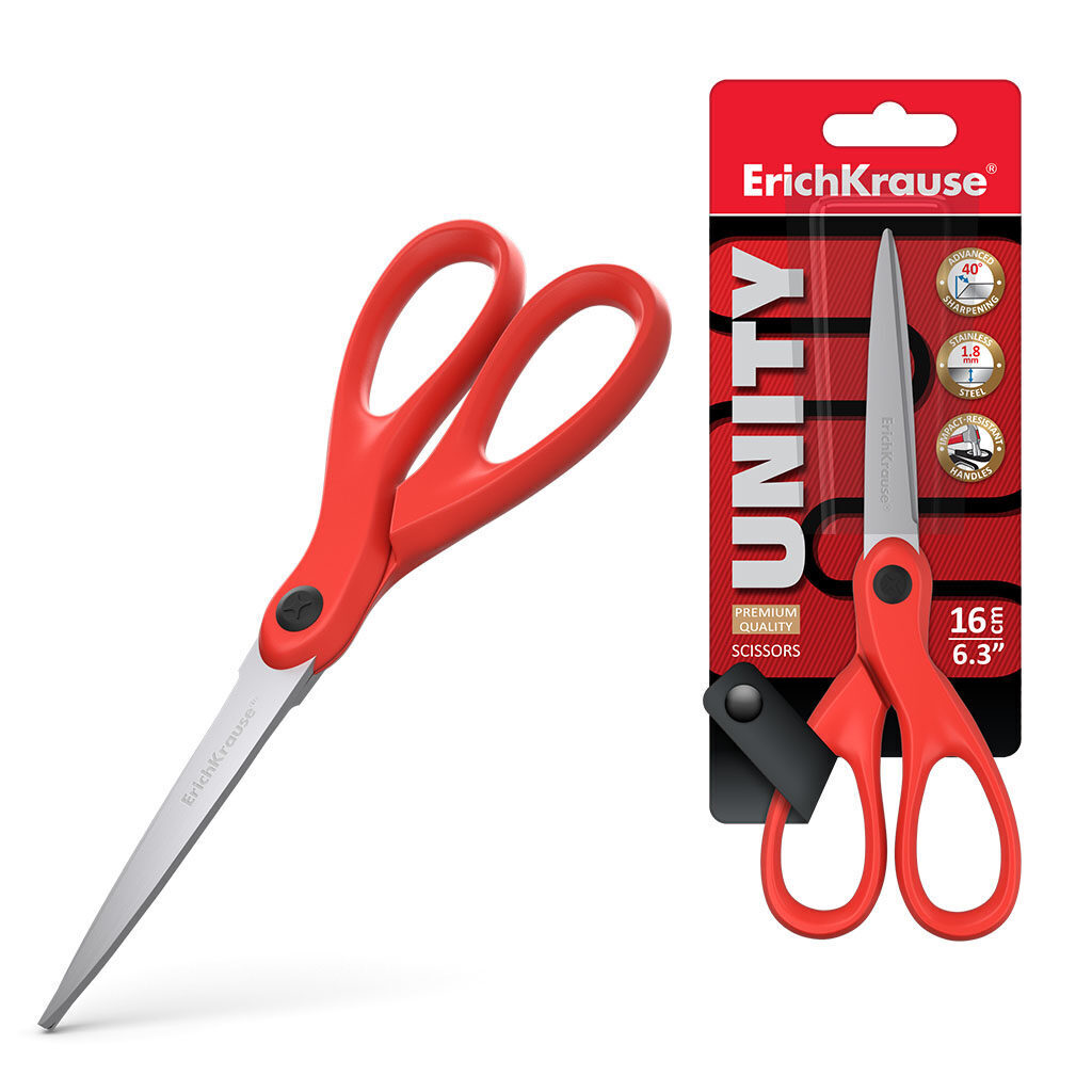 Ножницы Erich Krause "Unity" 16см с лезвиями из высококачественной нержавеющей стали с улучшенной двойной заточкой, повышающую легкость резки при максимальном количестве листов. Ручки классической формы изготовлены из ударопрочного пластика.