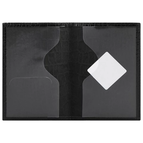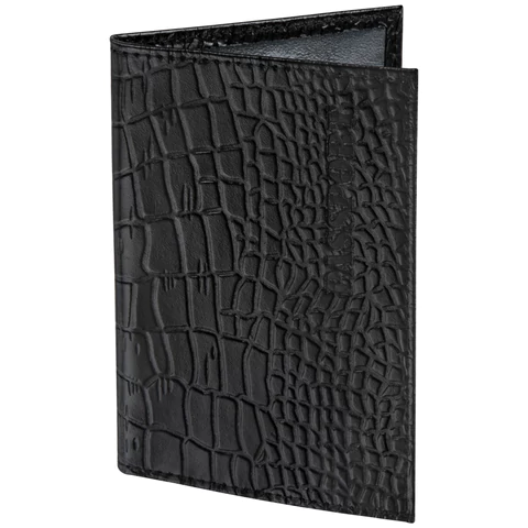 Модель выполнена из натуральной кожи с отделкой под кожу крокодила черного цвета, что подчеркнет стиль и изысканный вкус обладателя. Украшена тисненой надписью "PASSPORT", края прострочены. На внутреннем развороте расположены два кармана из прозрачного пластика. Упакована в пакет с европодвесом.