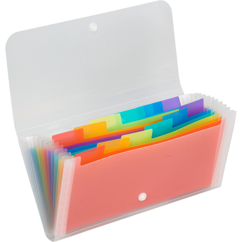 Папка на кнопке с 13-ю отделениями пластиковая 600 мкм, для документов формата DL (260x130x20 мм) цветные внутренние отделения толщиной 160 мкм, в комплекте с бумажными индексами, текстурная прозрачная