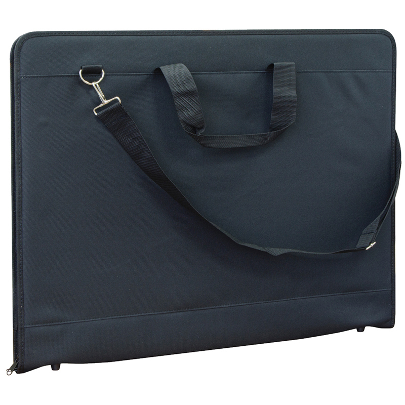 Папка для художников формата А2 чёрного цвета. Размер: 645*490*35 мм. Листы крепятся с помощью двух эластичных отстегивающихся лент. Снабжена ручками и съЁмным плечевым ремнем. Дно папки предохраняют пластиковые «ножки». Материал – полиэстер.