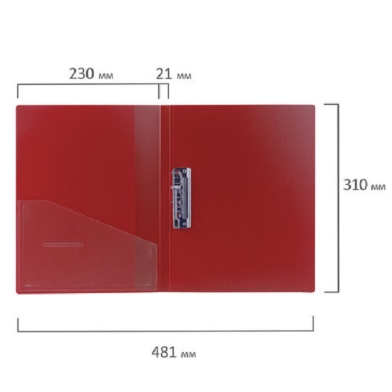 Изготовлена из высококачественного пластика толщиной 0,7 мм с оригинальной линейной фактурой. Обеспечивает хранение до 100 листов формата А4. Снабжена боковым прижимом и прозрачным внутренним карманом. Для идентификации имеется сменный бумажный корешок. Представлена в красном цвете. Поставляется в индивидуальной упаковке.