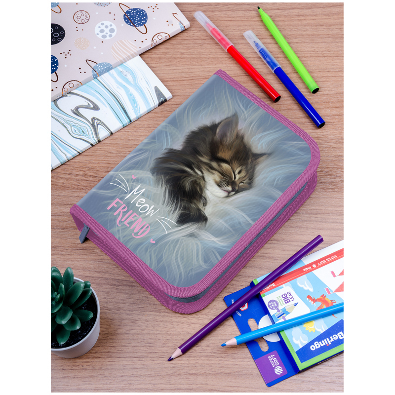 Удобный пенал для школьных канцелярских принадлежностей с одним отделением. Одна откидная планка внутри. Материал лицевой и внутренней поверхности - полиэстер с принтом. Внутри имеются резиночки-крепления для канцтоваров. Упакован в индивидуальный пакет. Без наполнения.