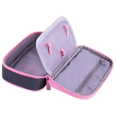 Изготовлен из полиэстера. Пенал прямоугольной формы с одним вместительным отделением, органайзером внутри и двумя дополнительными карманами. Застегивается на молнию с удобным пластиковым бегунком. Выполнен в сером цвете с контрастными розовыми акцентами в дизайне. Размер - 21х10х5 см.