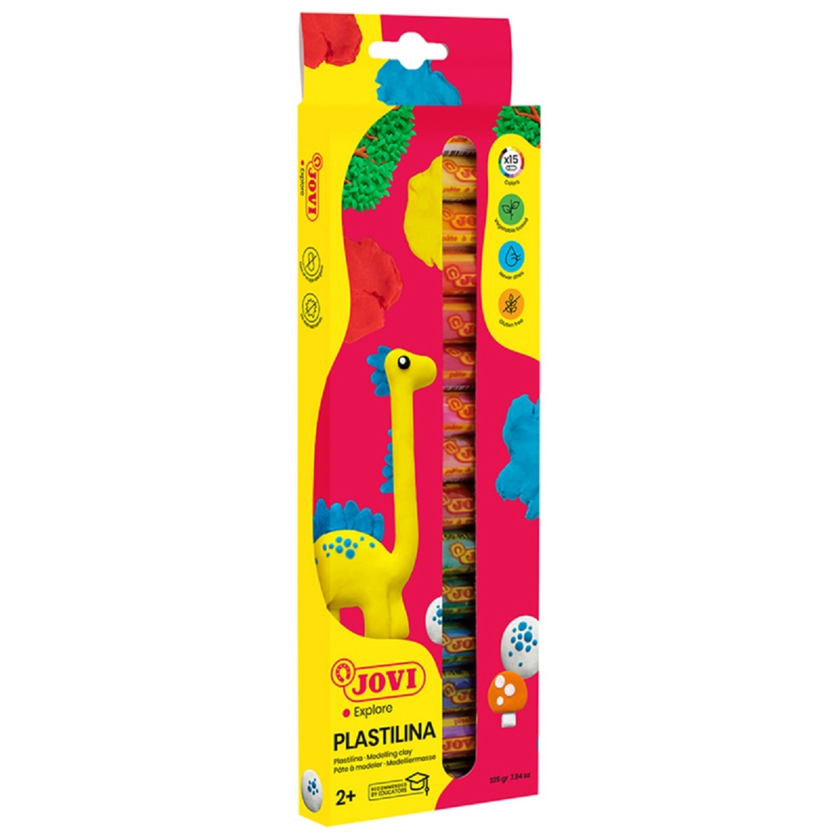 Набор пластилина из пятнадцати цветов (белый, желтый, оранжевый, розовый, красный, малиновый, голубой, синий, зеленый, темно-зеленый, фиолетовый, телесный, черный, темно-синий, кирпичный) по 15 грамм в картонной коробке с европодвесом.