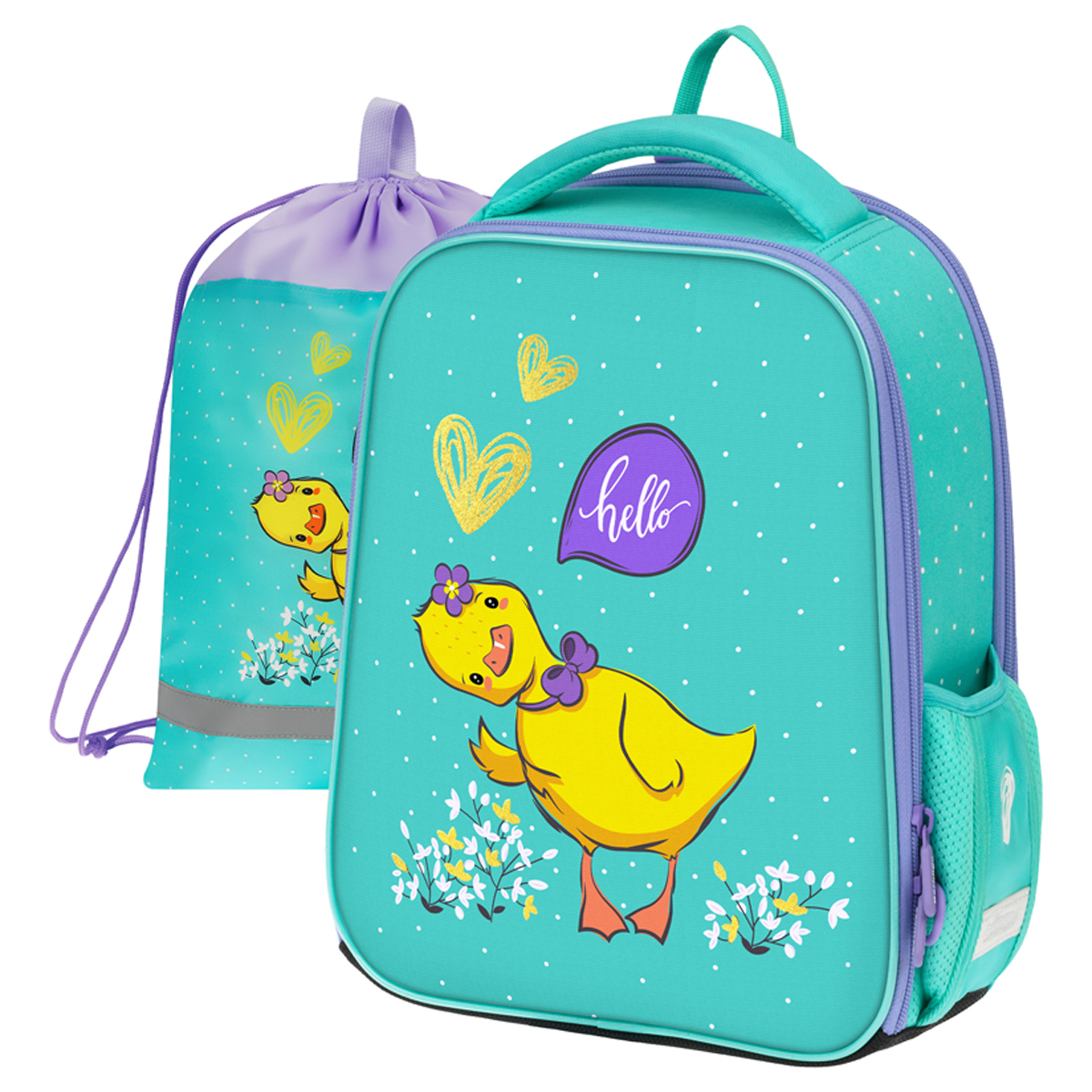 Ранец объёмом 13,5 литров имеет 2 отделения, одно из которых расположено у спинки и предназначено для учебных пособий формата А4+, 2 боковых кармана на резинке. Внутри предусмотрены разделители для учебных пособий и именная карточка для подписи.