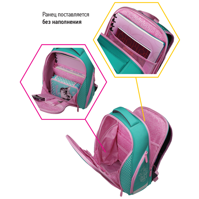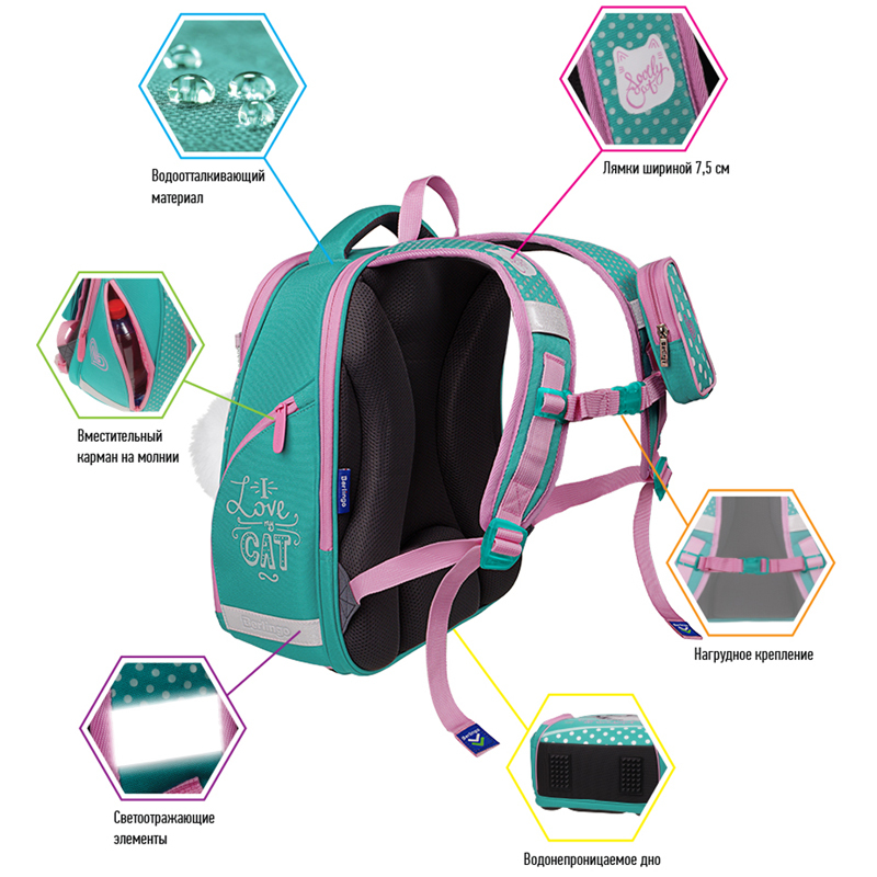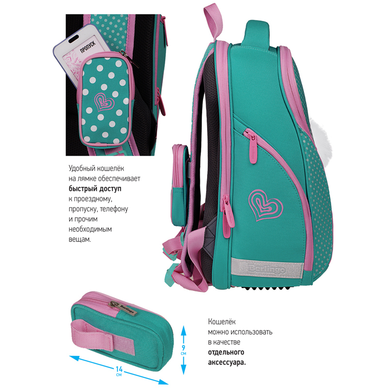 Эргономичный ранец серии Nova для детей младшего и среднего школьного возраста выполнен из легкого экологичного ЭВА материала с покрытием из высокопрочной нейлоновой ткани кордура. Кордура обладает водоотталкивающими свойствами и легко чистится. Благодаря анатомической вентилируемой спинке, регулируемым по длине лямкам и нагрудному креплению ранец плотно фиксируется на спине ребенка. Ранец имеет 2 отделения, 2 боковых кармана на молнии, съемный кошелек на лямке для быстрого доступа к необходимым вещам. Внутри предусмотрены разделители для учебных пособий, органайзер для письменных принадлежностей, карман для мобильного телефона, карабин для ключей и именная карточка для подписи. Отделение у спинки предназначено для учебных пособий формата А4+.