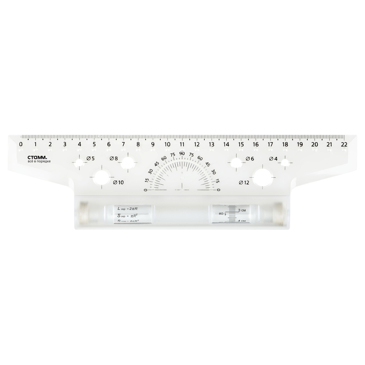 Рейсшина – это линейка с роликом, которая идеально подойдёт для нанесения ровных параллельных линий. Длина линейки – 22 см. Изделие равномерно перемещается по бумажной поверхности. Благодаря специальному покрытию ролика, линейка не проскальзывает по бумаге. Содержит транспортир 180 градусов и трафареты окружностей.
