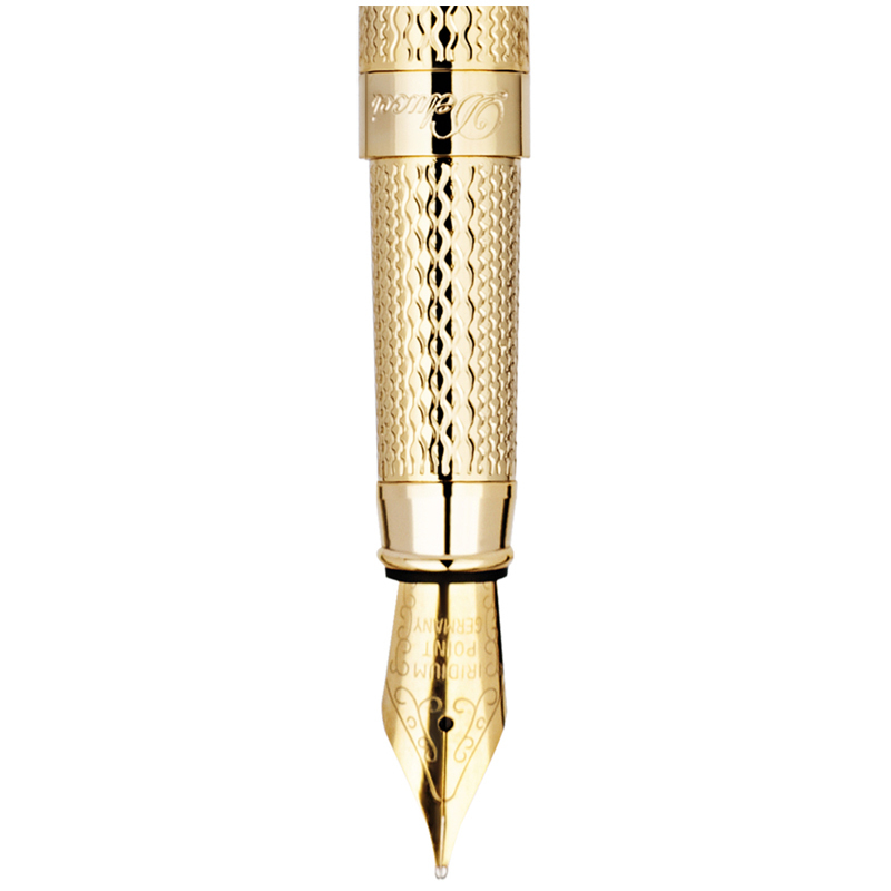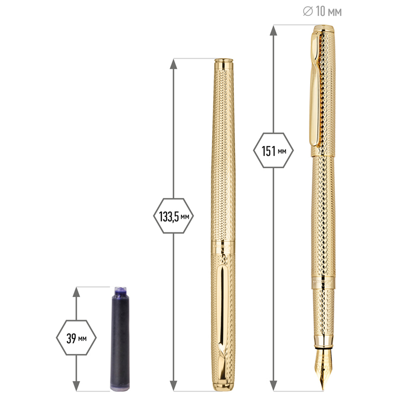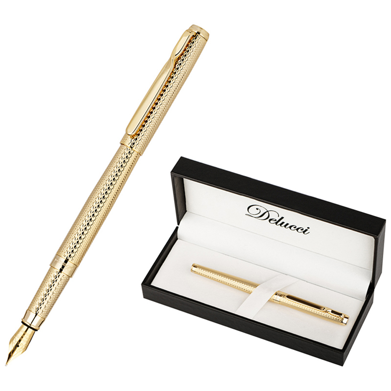 Перьевая подарочная ручка Delucci Celeste – это выбор тех, кто любит роскошь. На это намекает её золотистый корпус. Изящная гравировка делает корпус рифлёным и нескользящим, а медь и никелированное покрытие – прочным и качественным. Перо оставляет линию чёрными чернилами толщиной 0,8 мм, то есть данную ручку можно использовать для комфортного быстрого письма. Диаметр пишущего узла также составляет 0,8 мм. Клип из нержавеющей стали красиво закручен, но помимо красоты он несёт и практическую функцию – возможность закрепить пишущеё средство там, где это необходимо.