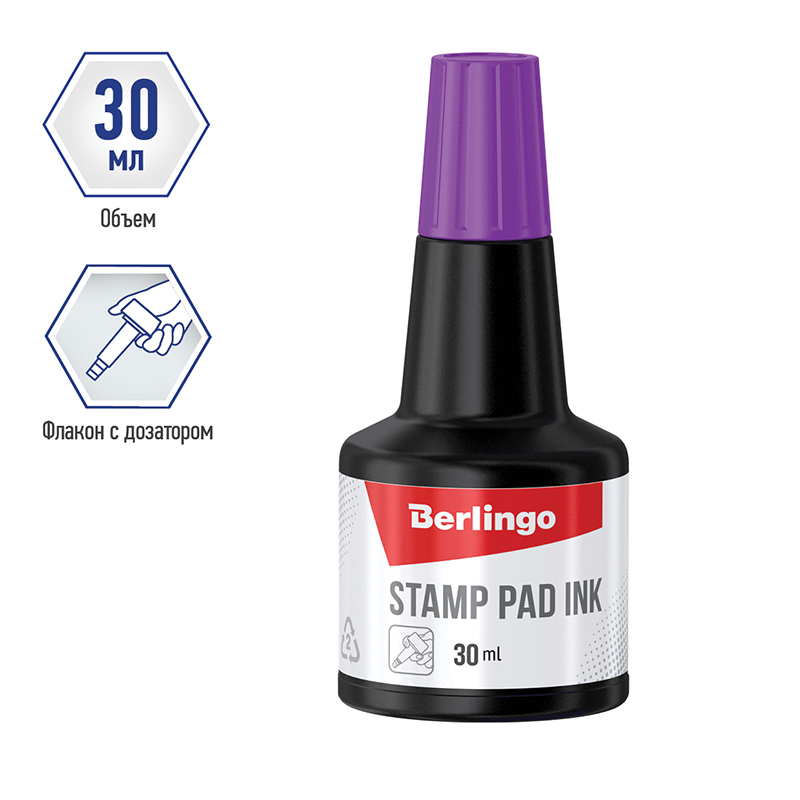 Штемпельная краска на водной основе для заправки штемпельных подушек. Цвет краски - фиолетовый. Объем 30 мл. Флакон оснащен дозатором и упакован в индивидуальную коробочку.