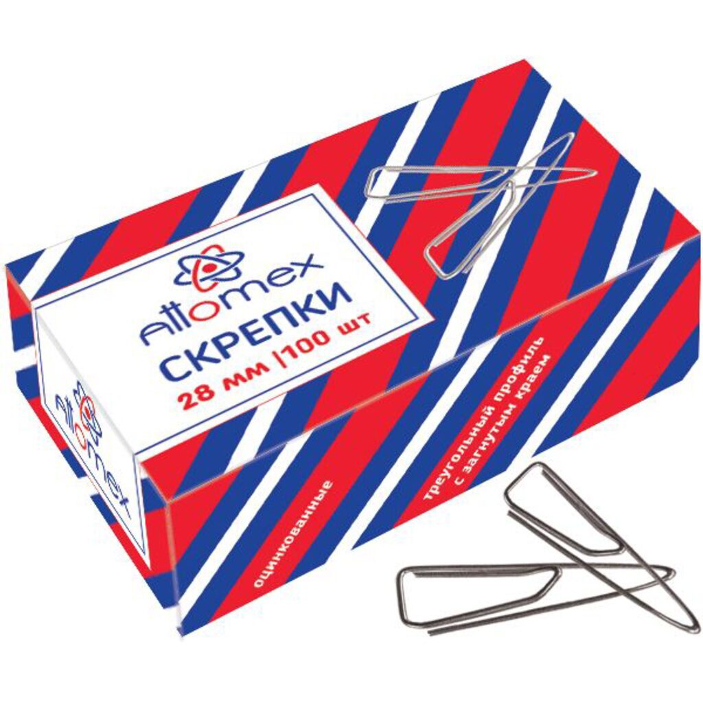 Скрепка — канцелярский предмет для скрепления листов бумаги. Скрепки металлические "Attomex", имеют размер 28 мм. Оцинкованные канцелярские скрепки, без покрытия. Гладкие, треугольной формы. Надежно скрепляют документы, не деформируют бумагу. Упакованы в картонной коробке по 100 скрепок.