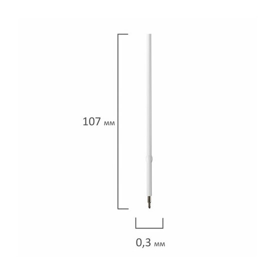 Длина стержня составляет 107 мм. Диаметр пишущего узла 0,7 мм создает тонкую линию письма, равную 0,35 мм. Имеет игольчатый наконечник. Цвет чернил - синий.