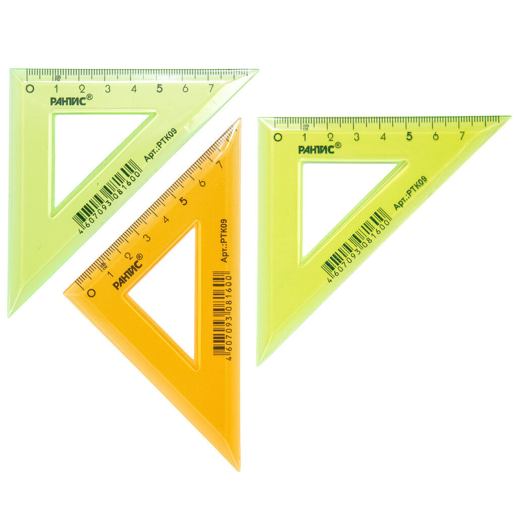 Треугольник 45 градусов 9 см с чёткой печатной миллиметровой шкалой. Гладкая глянцевая поверхность. Цвет: 4 ярких цвета ассорти (прозрачные).
