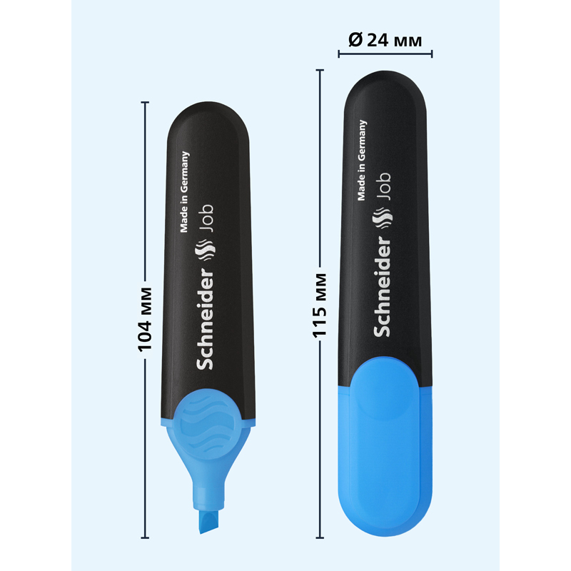 Универсальный текстовыделитель Schneider Job имеет светостойкие чернила яркого неонового голубого цвета на водной основе. Толщина линии варьируется от 1 до 5 мм. Упаковка: картонная коробка по 10 штук. Schneider Job подходит для различных типов бумаги. Текстовыделитель представлен со скошенным наконечником. Диаметр овального пластикового корпуса составляет 24 мм. Цвет колпачка и элементов корпуса соответствует цвету чернил.